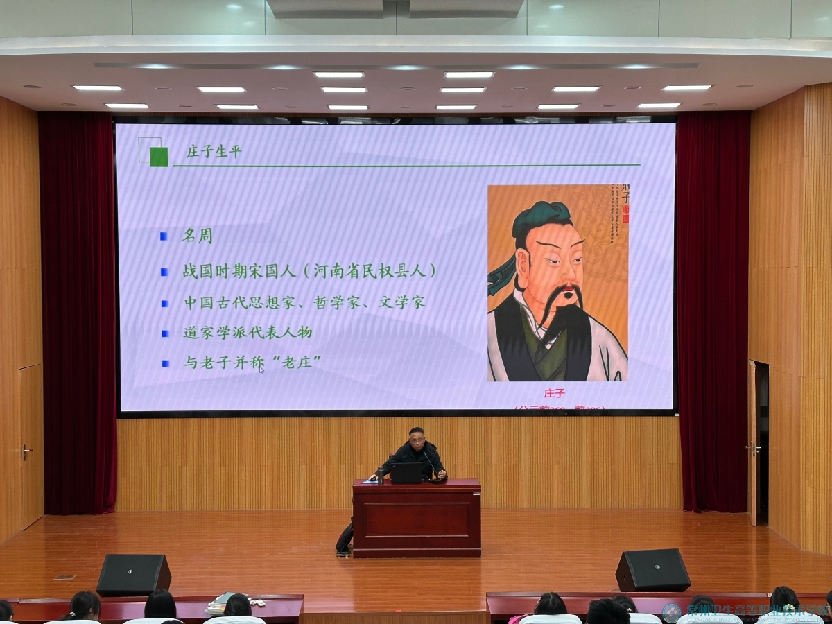 首先,潘老师播放了庄子生平介绍短片,介绍了庄子的生平和思想主张;然后,潘老师详细阐述了"涂滩之龟"与"庙堂之龟"、"濠梁之辩""子非鱼,安知鱼之乐"、"无用之用"、"随珠弹雀"、"庖丁解牛"、"井蛙不可语海"、"缘督以为经"、"天地与我并生"、"举世誉之而不加劝"等寓言故事,指出了庄子对自由与虚名、尊重他人视角、无用的价值、顺应规律的主体性觉醒观点;接着,潘老师结合庄子名言,结合学业、职场、人际场景剖析其当代价值,倡导同学们从"井蛙不可语海"中学会谦逊、尊重认知边界,从"缘督以为经"理解遵循规律、守护安康,从"天地与我并生"领悟万物共生的包容观,从"举世誉之而不加劝"坚守自我、不随波逐流;最后,潘老师总结,庄子智慧是当代人心灵良药,鼓励同学们将智慧融入生活,在纷繁中保持内心澄澈。